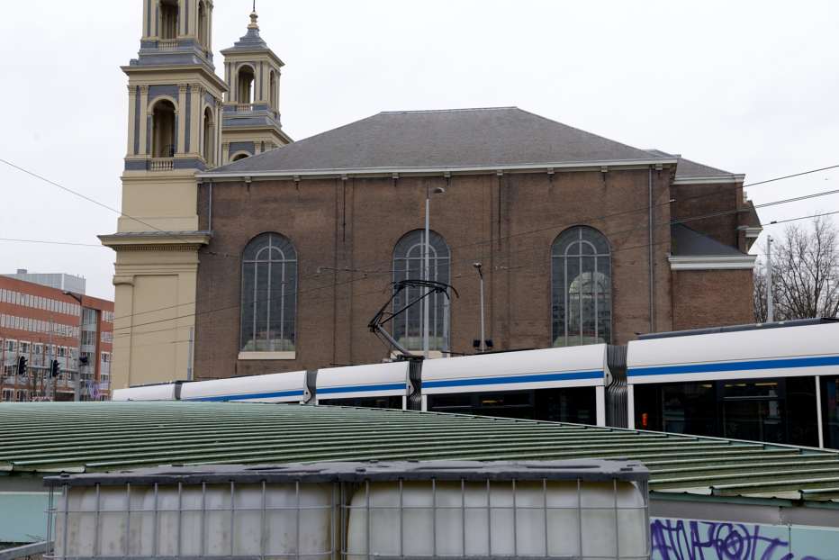 filmvertoning tijdens groepsexpositie in de voormalige vluchtkerk in Amsterdam-west